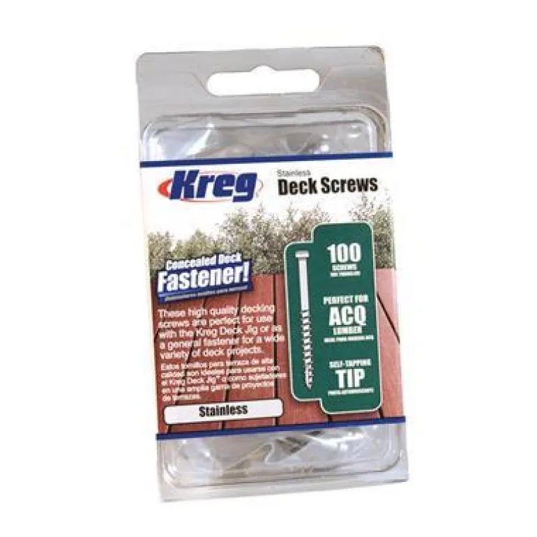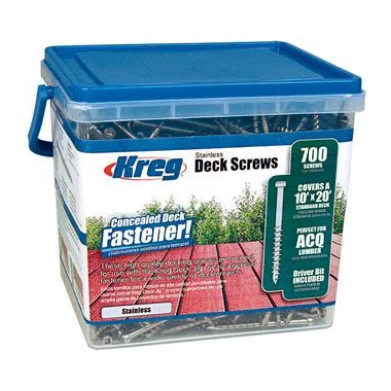700 kpl ruostumattomasta teräksestä valmistettuja kansiruuveja, 51 mm. Ruuvit on erityisesti suunniteltu käytettäväksi 3/4″:n ja 5/4″:n kansimateriaalien kanssa, ja ne toimivat hyvin Kreg Deck Jigin kanssa.