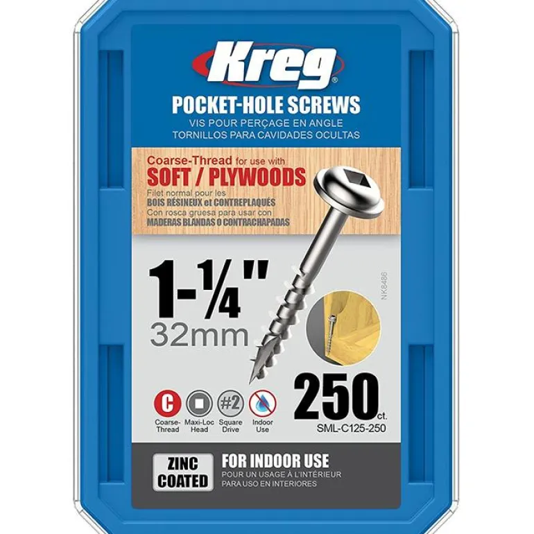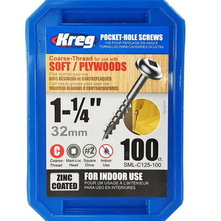 Kreg SML-C125-100 on 100 kpl harvakierteisiä galvanoituja 32 mm:n ruuveja, Maxi-Loc-pää.