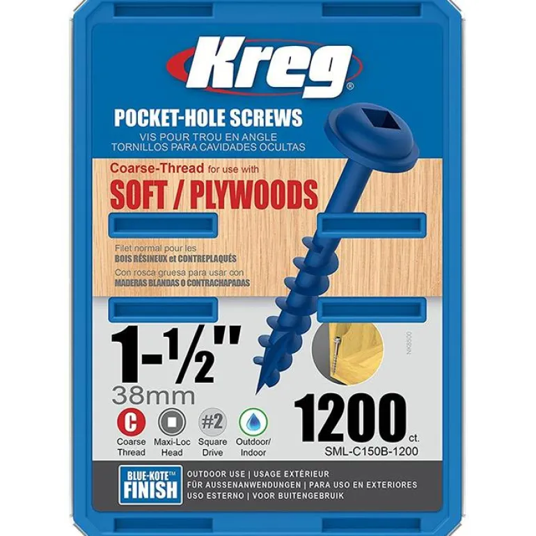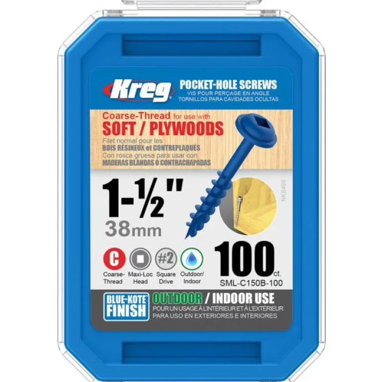 Kreg SML-C150B-100 on 100 kpl harvakierteisiä 38 mm:n ruuveja 22 mm:n levylle. Blue-Kote sopii ulko- ja sisäkäyttöön.