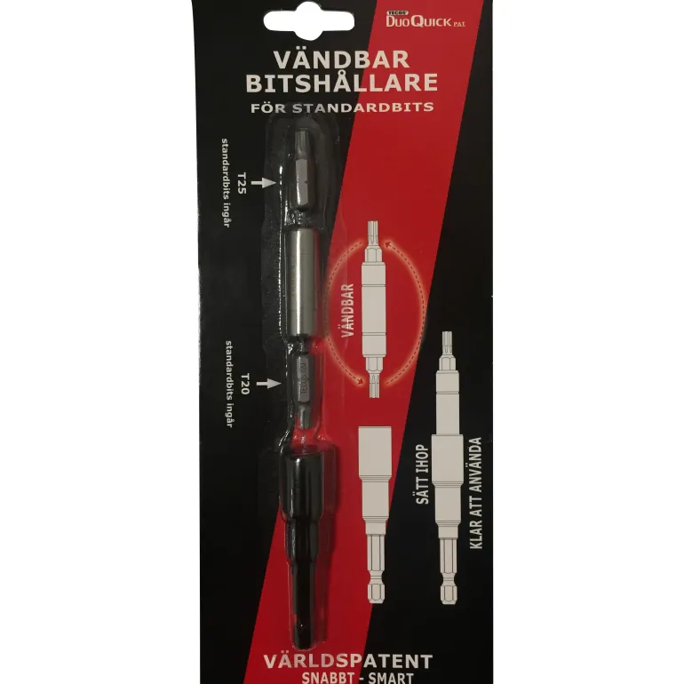 Tecos-kärkpidike DuoQuick-patentilla – käännettävät kaksoiskärkiputket, joilla ruuvikärkien vaihto on nopeaa. Mukana 1 kärkipidike, 1 kärkiputki ja 2 ruuvikärkeä.
