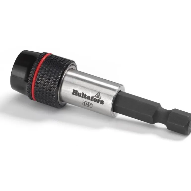 1/4-tuuman magneettinen kärjenpidin pikalukituksella, ammattikäyttöön. Pikalukituksen ansiosta kärjen voi asettaa paikalleen yhdellä kädellä ilman holkin taaksepäin vetämistä. Vapaasti pyörivän mustan holkin avulla kärjen voi vakauttaa käytön aikana.