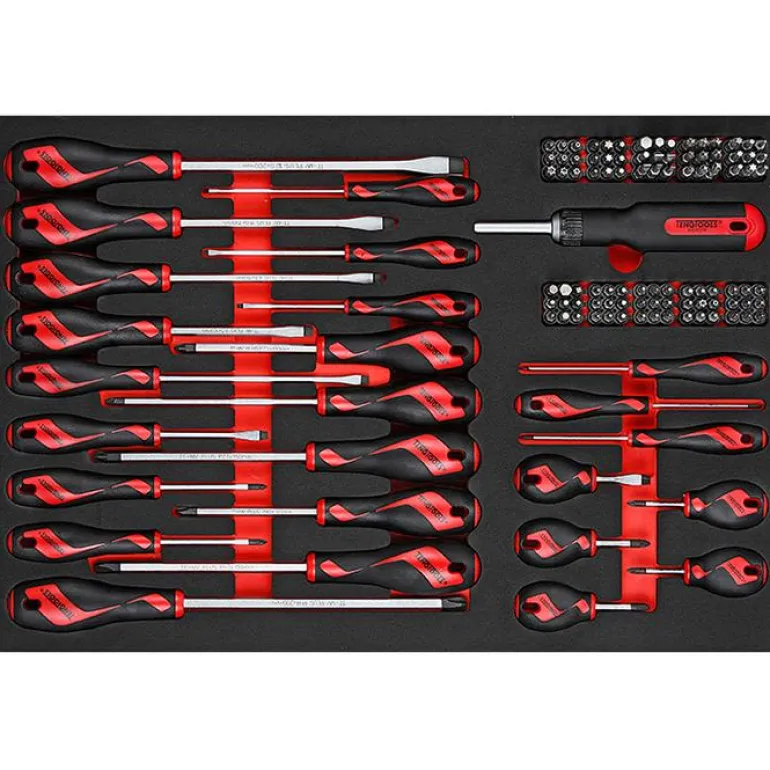 122-osainen ruuvitaltta- ja ruuvikärkisarja. Sarja toimitetaan Teng Toolsin säilytysjärjestelmässä, joka koostuu kolmesta erivärisestä EVA-vaahtomuovikerroksesta.