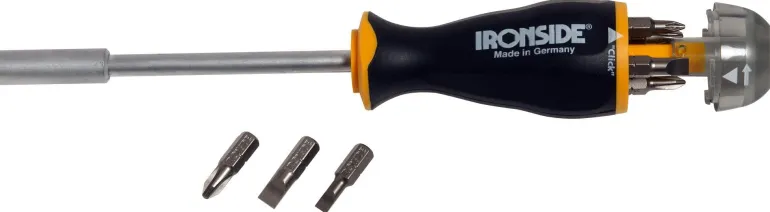 Nikkelöity terä 1/4″ kuusikulmahylsyllä ja upotetulla magneetilla, johon kiinnittyvät sekä ruuvauskärki että ruuvi. Miellyttäväotteinen ja ergonomisesti muotoiltu kaksikomponenttivarsi jossa vierimisenpysäytin sisältäen 8 kpl ruuvauskärkiä kätevässä lippaassa.