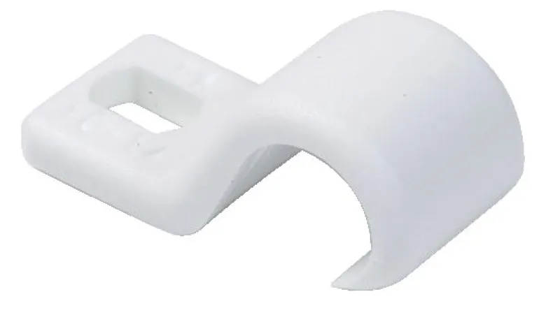 Valkoiset polypropeeniruuvikiinnikkeet pyöreiden kaapeleiden asentamiseen. Alustasta riippuen kiinnitykseen suositellaan naulatulppaa tai ruuvia.