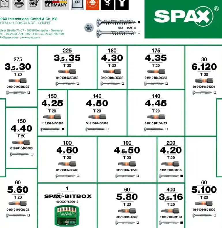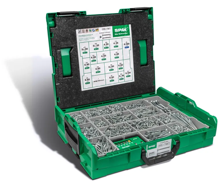 Spax -yleisruuvilajitelma muovisalkussa, joka pitää sisällään 2 445 kpl Torx -uppokantaruuveja (16 kokoa) ja pakkauksen Torx-kärkiä seuraavasti: 3,5×16-3,5×30-3,5×35-4,0×20-4,0×25-4,0×30-4,0×35-4,0×40-4,0×45-4,0×50-4,0×60-4,5×50-5,0×60-5,0×80-5,0×100-6,0×120. T-STAR plus -muotoilu, 4CUT ja WIROX -pinnoite.