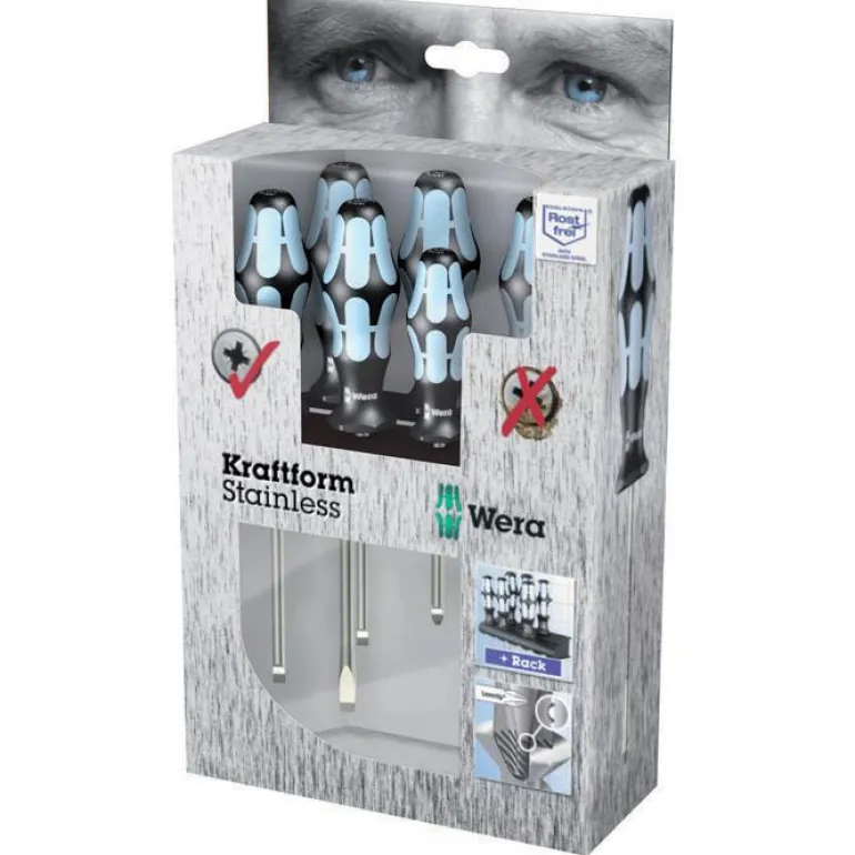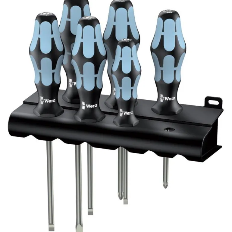 6-osainen ruuvimeisselisarja, sisältää kaksi ristipääruuvimeisseliä, kaksi ristiuraruuvimeisseliä ja kaksi talttapääruuvimeisseliä.