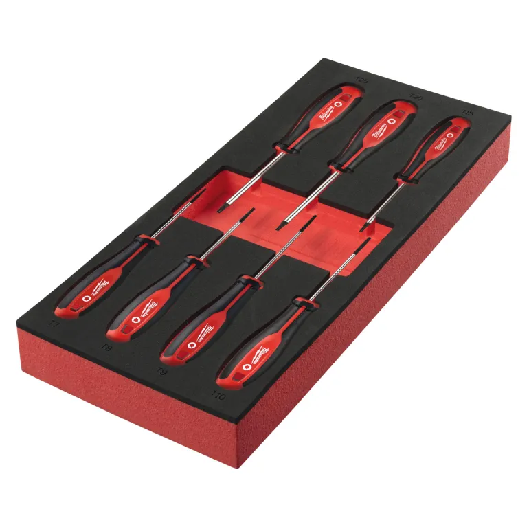 Milwaukee 4932492391 on ruuvitalttasarja sisältäen ruuvitalttoja mukavalla Tri-Lobe-kahvalla, joka on optimoitu maksimaalista käyttömukavuutta ja suuren vääntömomentin sovelluksia varten. Pysyvät näkyvät tunnistemerkinnät työkalun nopeaa tunnistamista varten. Reiät työkaluvarmistukselle. Karkaistut magneettiset kärjet takaavat maksimaalisen pidon ja kestävyyden. 3-sivuiset pyörimistä estävät kahvat. Kahvat sopivat jakoavaimelle lisäkiristystä varten. T7x65, T8x65, T9x75, T10x75, T15x75, T20x100, T25x100. Vaahtomuoviset sisäosat työkalujen säilytystä varten.