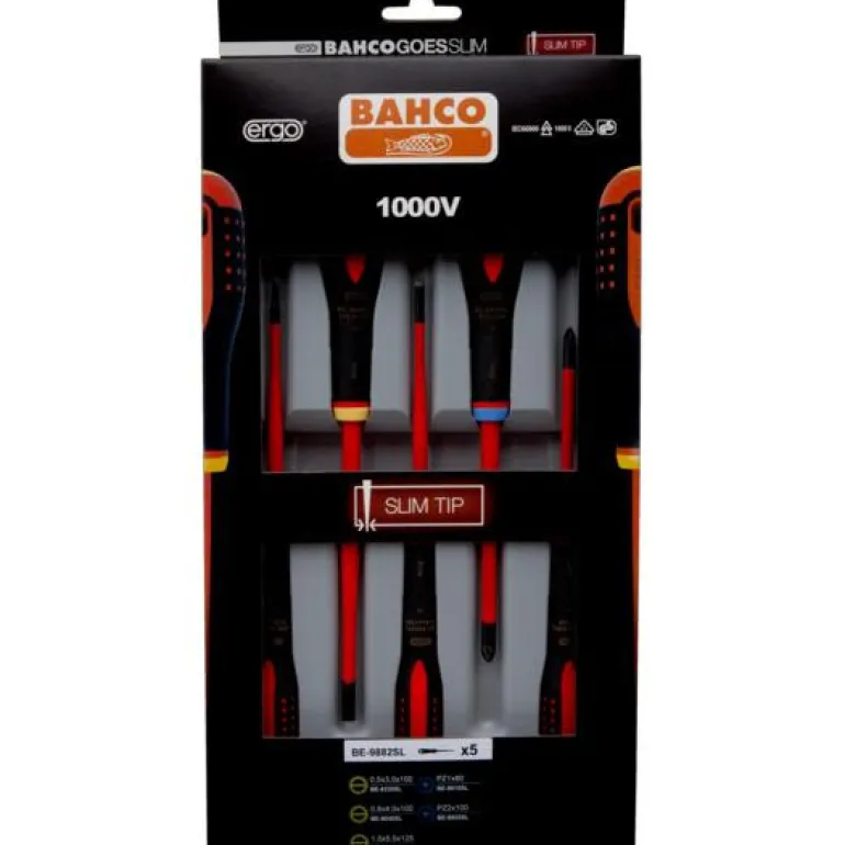 Bahco BE-9882SL on 5-osainen sarja, jossa 1000 V:lle eristetyt ruuvitaltat, ERGO™, erityisen kapealla terällä. Ura- ja Pozidriv-ruuveille.