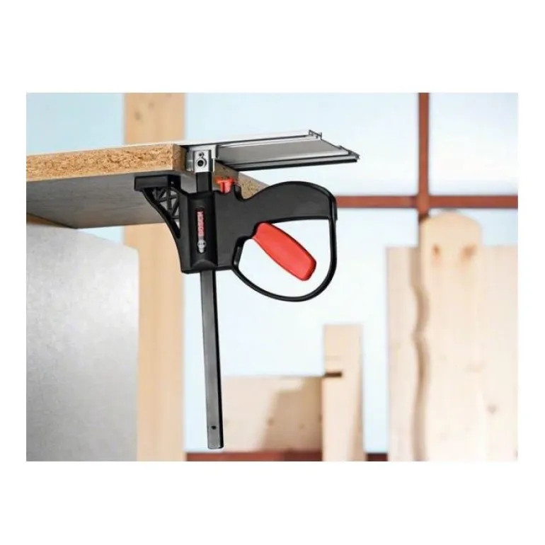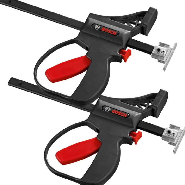 Kaksi ruuvipuristinta Bosch -ohjainkiskoihin (paitsi FSN 70 ja 140). FSN KZW puristin mahdollistaa ohjainkiskojen luotettavan ja nopean kiinnityksen työkappaleisiin.