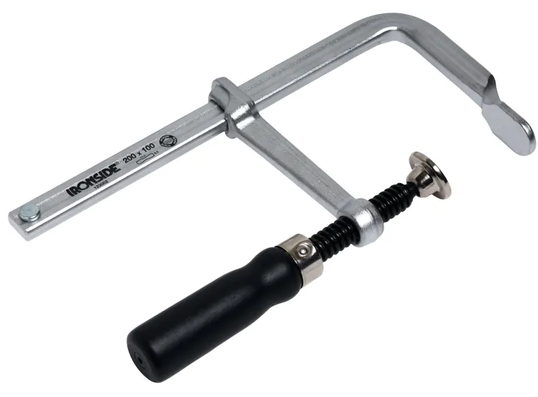 Takoterästä. Kiiltosinkitty, profiloitu kisko, pallonivelinen puristuslevy ja puukahva.