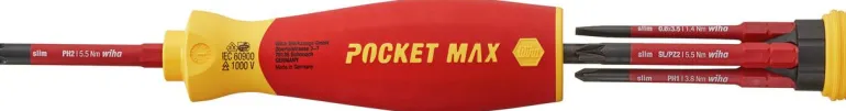Wihan kompakti ja kevyt PocketMax® electric makasiiniruuvimeisseli, joka mahtuu helposti minkä tahansa paidan tai housun taskuun ja on ihanteellinen kumppani jokaiselle asentajalle. Kahvassa turvallisesti säilytettävässä kärkivarastossa on neljä slimBit-ohutkärkeä. Magneettisen sulkutoiminnon ansiosta kärkivarasto voidaan helposti avata slimBit-kärkien poistamista varten. Oikean kärjen etsiminen on nyt menneisyyttä. Suljettaessa makasiini liukuu kiinni, ja sulkeutuu magneetin ansiosta kuin itsestään. Plussaa tuo myös käännettävä nuppi, joka takaa helpon käsiteltävyyden. Myös turvallisuuden suhteen PocketMax® electric tarjoaa kaiken mahdollisen. Sekä makasiinikärkipidin että sen sisältämät slimBits-ohutkärjet on sertifioitu kansainvälisen standardin IEC 60900 mukaisesti. Kapeiden, 75 mm pituisten slimBits-ohutkärkien suojaeristys on integroitu täydellisesti kärkiin, minkä ansiosta niillä ulottuu myös syvällä oleviin ruuveihin tai jousilukkoihin.