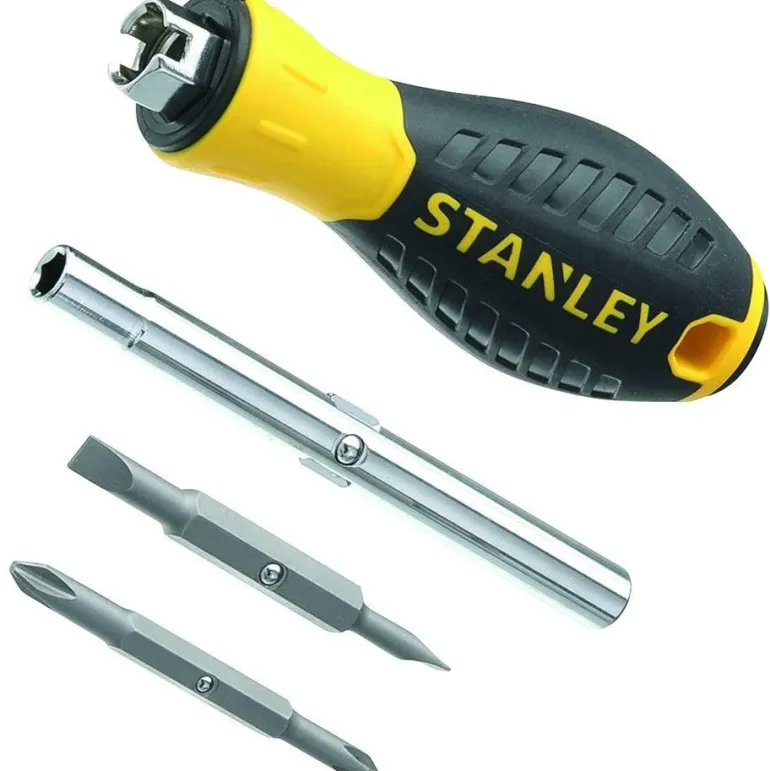 Monitoimiruuvitaltta ja ruuvikärjet. Taltassa on ruosteenkestävä kromattu terä ja sisäänrakennettu kuusiokaula, joka mahdollistaa lisävipuvoiman jakoavaimella. Jakoavaimella voidaan käyttää lisävääntömomenttia mutterin vääntämisen.