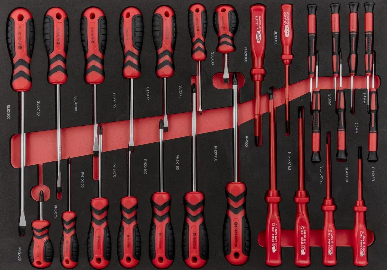 27-osainen ruuvitalttasarja, joka sisältää kromivanadiiniteräksestä valmistettuja ruuvitalttoja lajiteltuna vaahtomuoviseen moduuliin, jossa on oma paikka ja merkintä kullekin työkalulle.