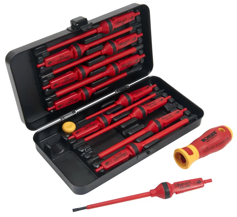 14-osainen VDE-ruuvitalttasarja, jota voidaan käyttää sekä ruuvitalttana että tarkkuustalttana. Ergonomisesti muotoiltu kaksikomponenttinen talttakädensija ja tarkkuustalttakärki. 12 kpl irtonaisia, eristettyjä teriä ura-, Phillips-, Pozidriv- ja Torx-kärjillä. Eristetyt ja hyväksytyt IEC/VDE-määräysten mukaisesti työskentelyyn jännitteisessä ympäristössä 1000V saakka.