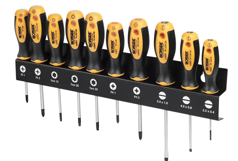 Taltta, PH, PZ ja Torx -päät. Setti sisältää 10 yleisintä ruuvitalttaa sekä kätevän seinätelineen. Kaksiosaiset rungot sekä ergonomiset kahvat