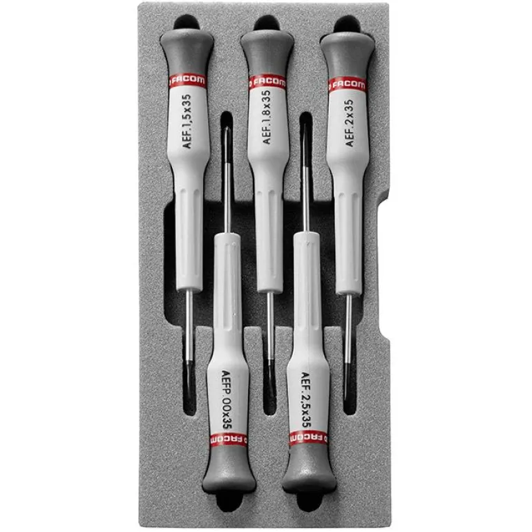 Facom AEF.J1 Micro-Tech on 5-osainen ruuvitalttasarja, johon kuuluu 4 kpl uraruuvitalttoja 1,5 / 1,8 / 2 ja 2,5 mm sekä 1 kpl PH1-ruuvitaltta 2,5 mm.