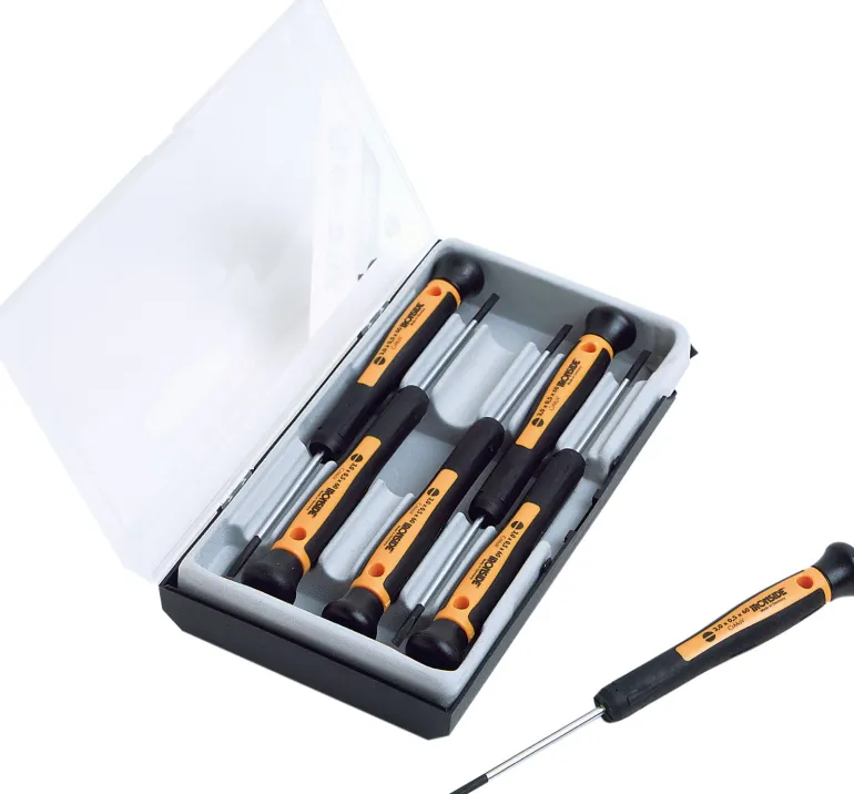 Kätevässä säilytysrasiassa oleva sarja joka sisältää 6 kpl tavallisimpia elektroniikkaruuvitalttoja. Niklatut kromi-molybdeeni-vanadiiniteräksiset terät mustatuilla kärjillä jotka lisäävät tarkkuutta ja kestävyyttä.