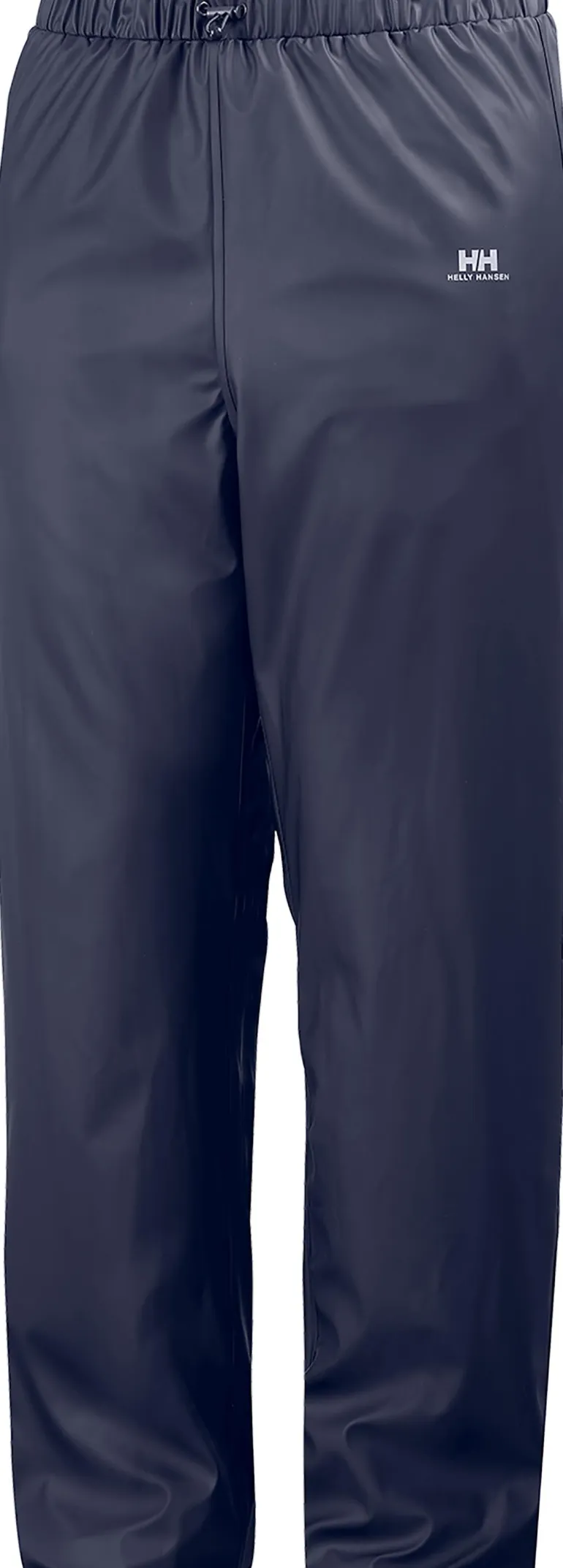 Vedenpitävästä materiaalista valmistetut sadehousut, joissa heijastavat yksityiskohdat, joustava vyötärö ja nepparisäätö.