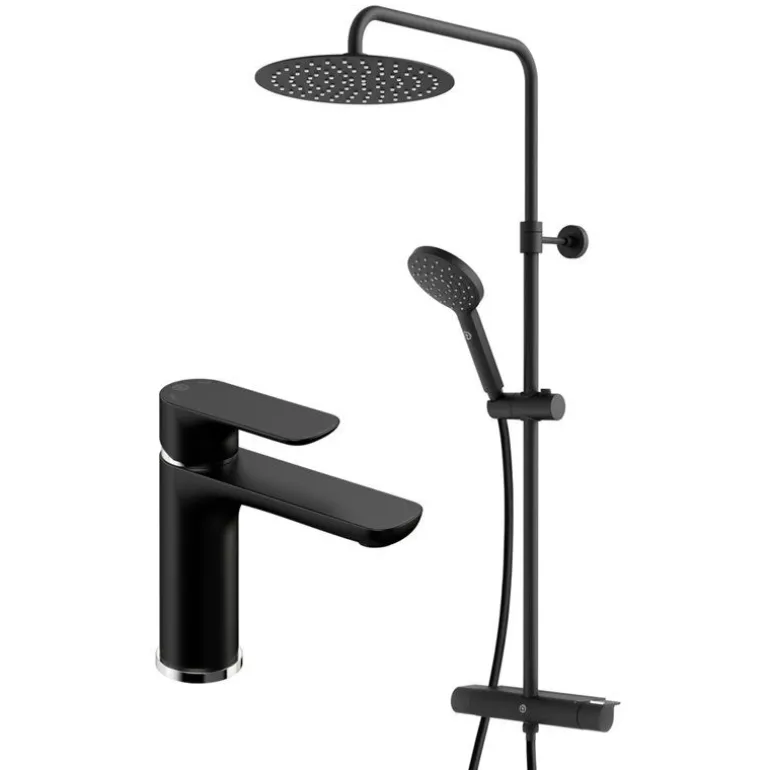 Gustavsbergin Estetic -sarjan sadesuihkupaketti sisältäen Estetic -sadesuihkun suihkuhanalla ja Estetic -pesuallashanan.