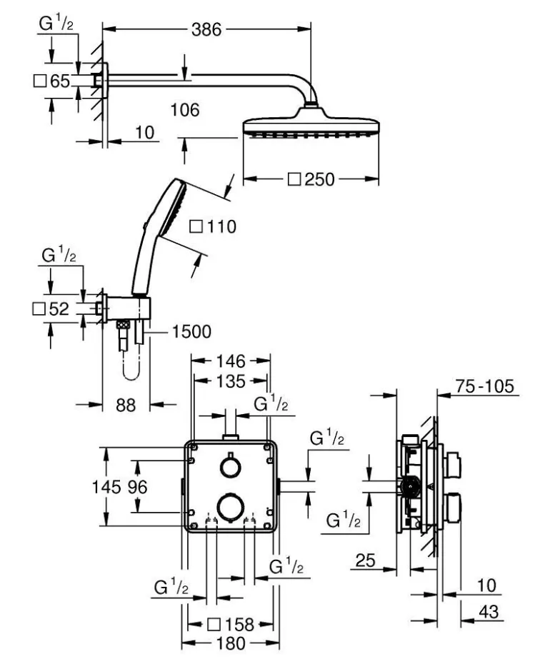 250×250 mm:n sadesuihku 380 mm:n suihkuvarrella tarjoaa pehmeän ja rentouttavan Rain-suihkun. 110×110 mm:n käsisuihku tarjoaa sekä voimakkaan ja kohdistetun Jet-suihkun että rauhoittavan Rain-suihkun, joita ohjataan Grohe SmartSwitch -ohjaimella. Käsisuihkun mukana tulee käsisuihkun seinäpidike seinäliitännällä ja 1500 mm:n suihkuletku TwistStop-muotoilulla, joka estää letkun kiertymisen. Grohe DreamSpray -teknologia takaa tasaisen vedenjaon jokaisesta SpeedClean -silikonisuuttimesta, jotka on lisäksi helppo puhdistaa sormella. Kestävä Grohe Long-Life -pinta on helppo pitää puhtaana ja säilyttää pinnat laadukkaina vuosien ajan. Grohe FastFixation -järjestelmän ansiosta etupaneelin asennus on helppoa – lukitusjärjestelmä, etulevy ja tiiviste seinää vasten, joka estää vuotojen riskin.