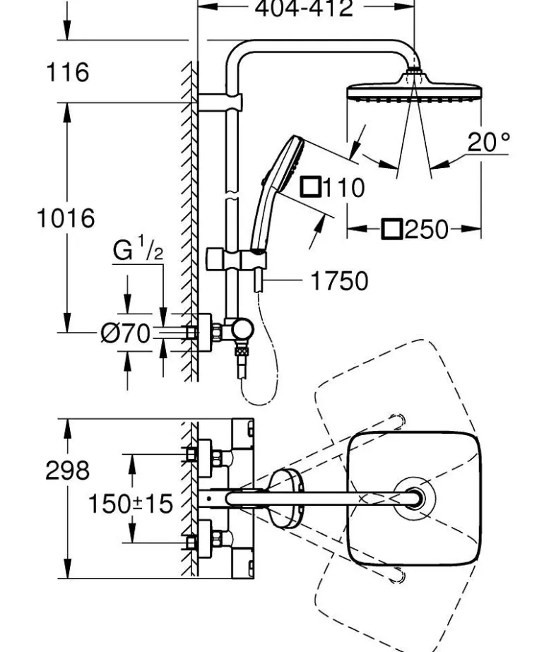 Vaakasuora käännettävä 390 mm suihkuvarsi