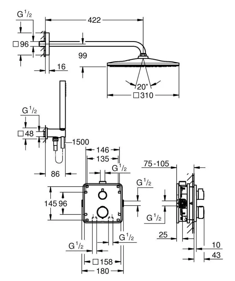 Reilun kokoinen 310×310 mm pääsuihku 422 mm varrella tarjoaa pehmeän ja rentouttavan Grohe PureRain -suihkun. Slim stick -käsisuihku 1500 mm TwistStop -letkulla ja Normal -suihkutyypillä. Käsisuihkun mukana tulee lisäksi käsisuihkun seinäpidike käsisuihkun seinäliitännällä. Grohe DreamSpray -teknologia takaa tasaisen vedenjaon jokaisesta SpeedClean -silikonisuuttimesta, jotka on lisäksi helppo puhdistaa sormella. Kestävä Grohe Long-Life -pinta on helppo puhdistaa ja säilyttää pinnan laadukkaana vuosiksi eteenpäin.