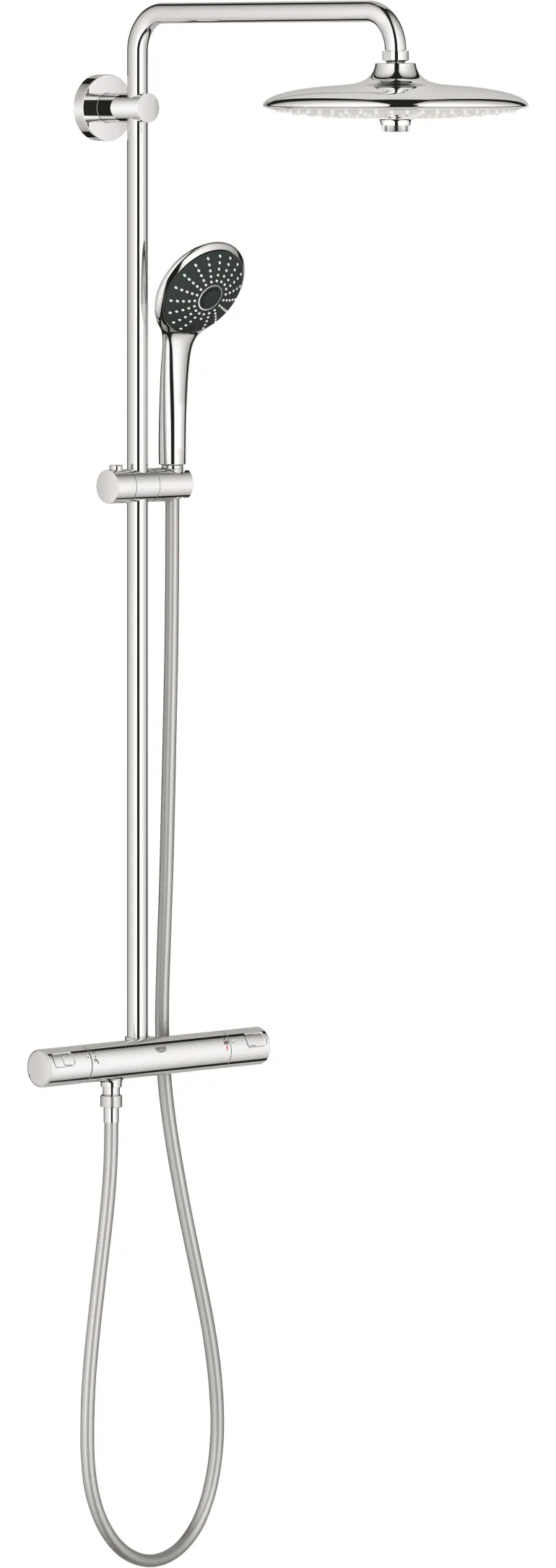 Kromattu sadesuihkusetti termostaatilla ja 160 mm:in kiinnitysmitoilla M26-ulkokierteellä. Settiin sisältyy ylä- ja käsisuihku, molemmat varustettu kolmella suihkutoiminnolla.