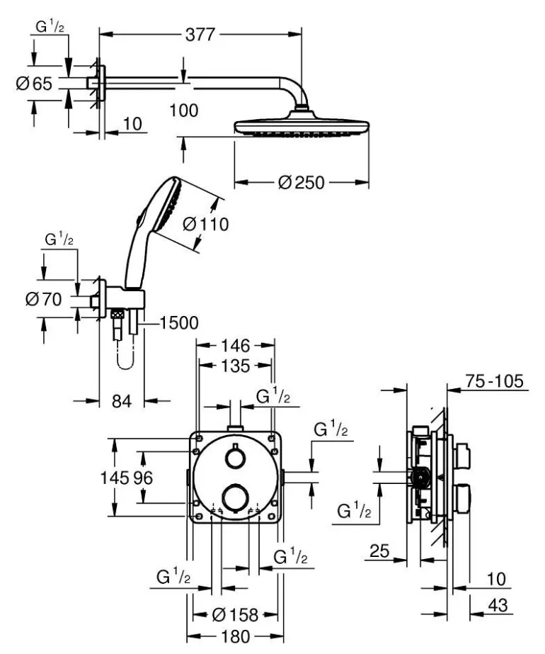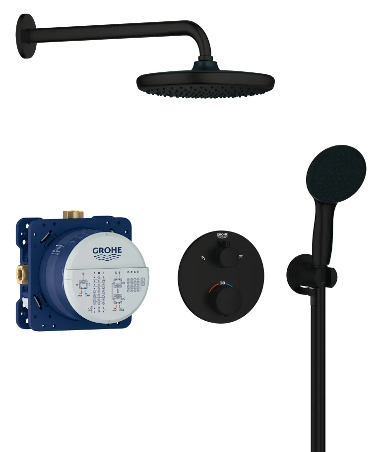 250 mm:n sadesuihku 380 mm:n suihkuvarrella tarjoaa pehmeän ja rentouttavan Rain-suihkun. 110 mm:n käsisuihku tarjoaa sekä voimakkaan ja kohdistetun Jet-suihkun että rauhoittavan Rain-suihkun, joita ohjataan Grohe SmartSwitch -ohjaimella. Käsisuihkun mukana tulee käsisuihkun seinäpidike seinäliitännällä ja 1500 mm:n suihkuletku TwistStop-muotoilulla, joka estää letkun kiertymisen. Iskunkestävä silikonirengas suojaa vaurioilta käsisuihkun pudotessa. Grohe DreamSpray -teknologia takaa tasaisen vedenjaon jokaisesta SpeedClean -silikonisuuttimesta, jotka on lisäksi helppo puhdistaa sormella. Kestävä Grohe Long-Life -pinta on helppo pitää puhtaana ja säilyttää pinnat laadukkaina vuosien ajan. Grohe FastFixation -järjestelmän ansiosta etupaneelin asennus on helppoa – lukitusjärjestelmä, etulevy ja tiiviste seinää vasten, joka estää vuotojen riskin. Grohe Precision -suihkujärjestelmä piiloasennukseen on erinomainen ratkaisu ylelliseen suihkukokemukseen. Laadukas suihkujärjestelmä erinomaisella toimintavarmuudella.