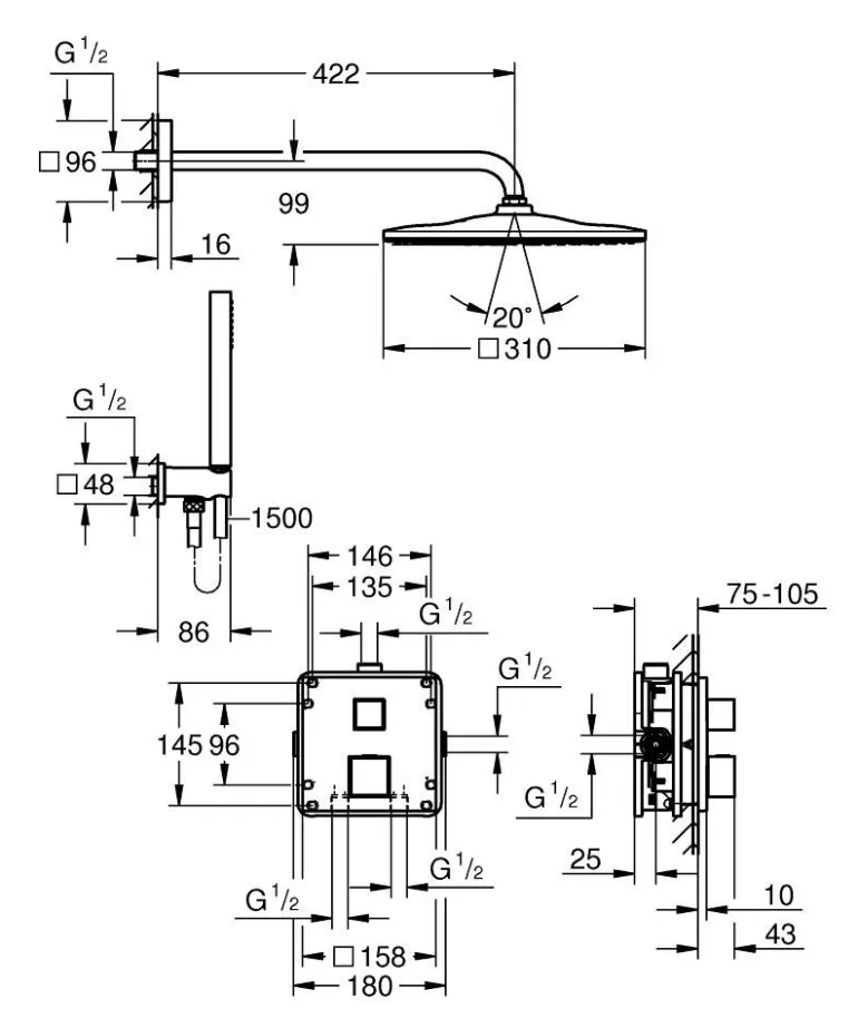310×310 mm:n sadesuihku 422 mm:n suihkuvarrella tarjoaa pehmeän ja rentouttavan Grohe PureRain -suihkun. Slim stick -käsisuihku 1500 mm TwistStop -letkulla ja Normal -suihkutyypillä. Grohe DreamSpray -teknologia takaa tasaisen vedenjaon jokaisesta SpeedClean -silikonisuuttimesta, jotka on lisäksi helppo puhdistaa sormella. Kestävä Grohe Long-Life -pinta on helppo puhdistaa ja säilyttää pinnan laadukkaana vuosiksi eteenpäin.