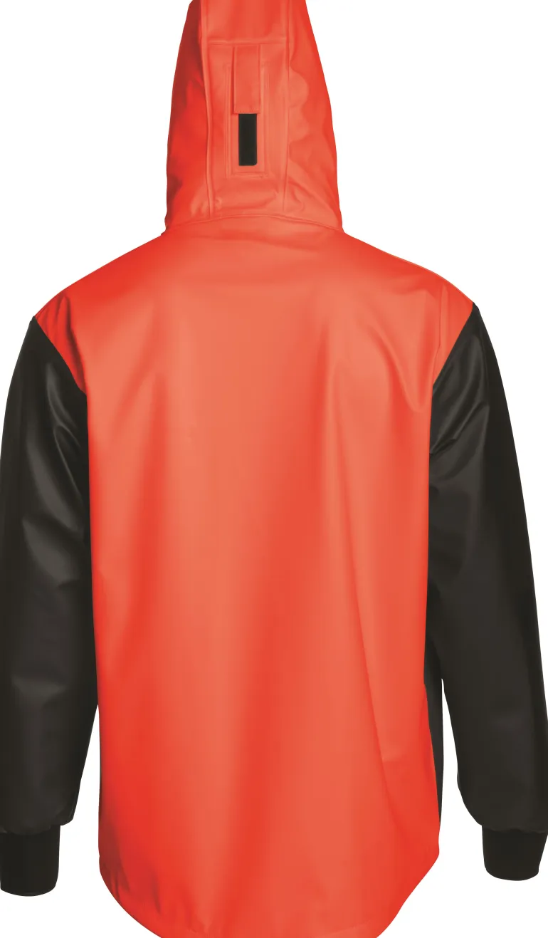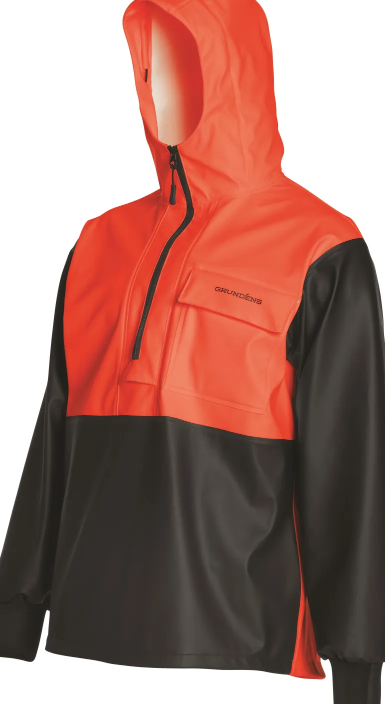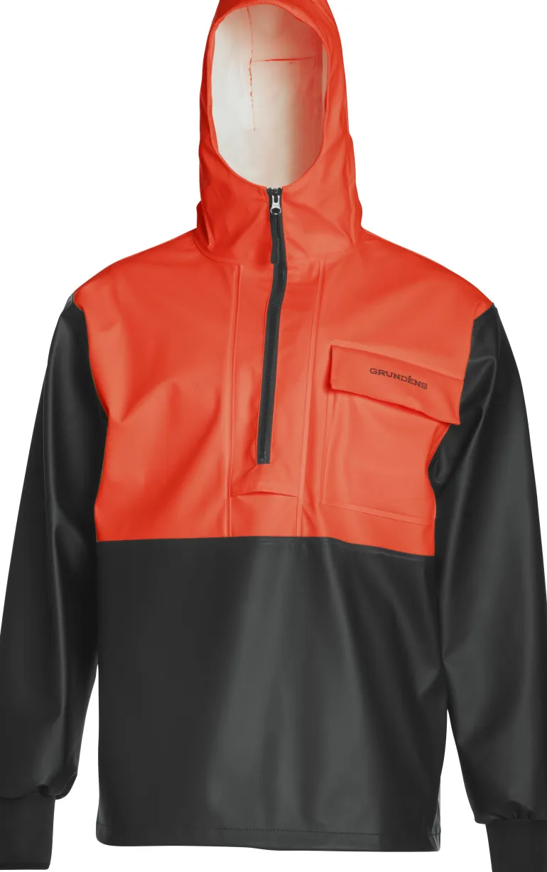 Anorakki, jossa säädettävä huppu ja säädettävä helma. Rintatasku. Neopreenihihansuut ja hihakiila käsivarsissa lisää liikkuvuutta.