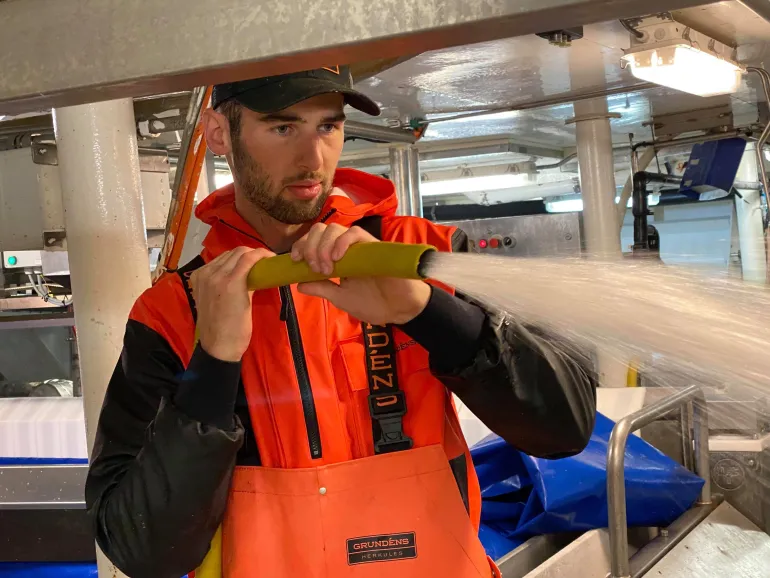 Anorakki, jossa säädettävä huppu ja säädettävä helma. Rintatasku.