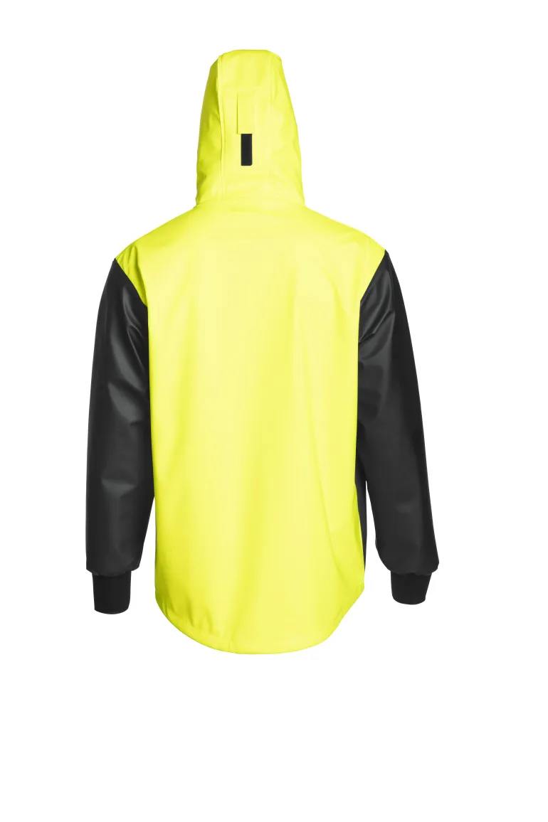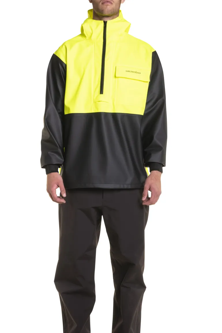 Anorakki, jossa säädettävä huppu ja säädettävä helma. Rintatasku. Neopreenihihansuut ja hihakiila käsivarsissa lisää liikkuvuutta.