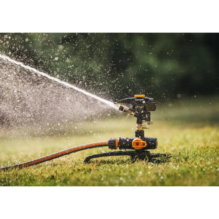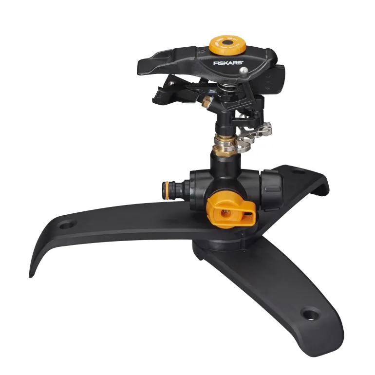 Sadetin, jossa kestävä metallinen pää. Sprinklerissä On/Off-nuppi. Vakaa jalusta, jossa on sisäänrakennettu jousitus, helpottaa säilytystä. Vakiokytkin – sopii muiden valmistajien kanssa.
