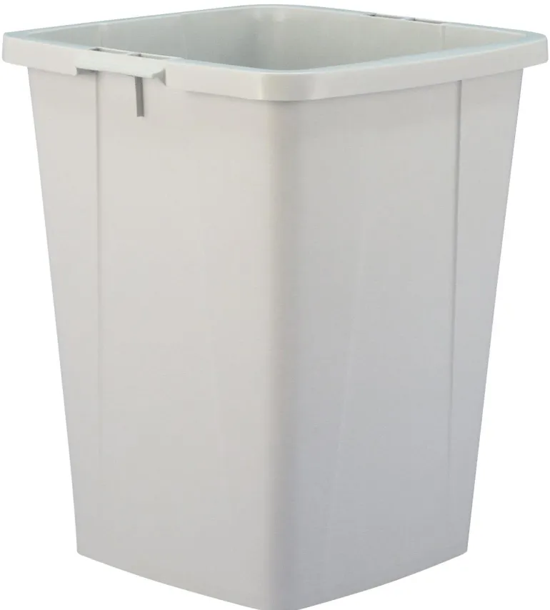 Harmaa polypropeeniastia, jonka tilavuus on 90 litraa ja mitat 505x483x600 mm. Ilman kantta.