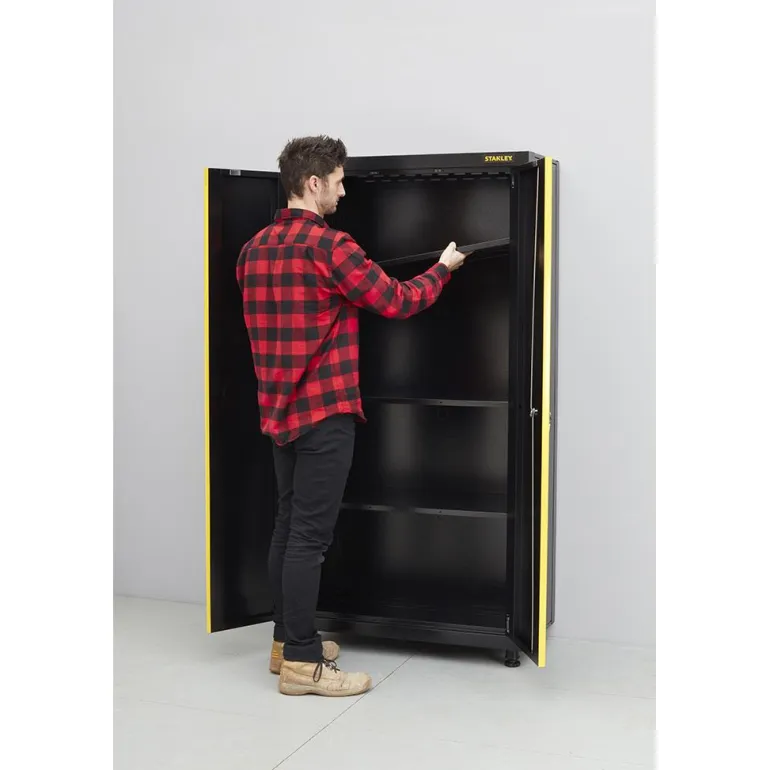 STANLEY® Ready- To- Assemble on helposti asennettava säilytysratkaisusarja autotalleihin ja työtiloihin. Ihanteellinen työkalujen ja työtarvikkeiden järjestämiseen ja säilytykseen turvallisesti ja organisoidusti. Moduulisäilytysratkaisu on suunniteltu varmistamaan, että asennustöihin ei hukkaannu aikaa. Toimitetaan litteässä paketissa, vaatii äärimmäisen vähän asennustöitä ja aikaa. Korkea 2-ovinen kaappi, jossa kolme hyllyä, on täysileveä ja sen kuormankestävyys on 68 kg. Sopii täydellisesti suurten työkalujen ja varusteiden säilytykseen. Kaapin kokonaiskuormankestävyys on 300 kg. Vankka teräsrunko tuo lisävahvuutta ja kestävyyttä. Sisäänrakennettu lukkojärjestelmä magneettikoukuilla varmistavat ovien lukituksen ja sulkemisen. Neljä säädettävää jalkaa mahdollistavat tasaisen asennuksen myös epätasaisella lattialla. Kaappi on taitettava, eli suuret osat taittuvat yhdellä liikkeellä auki ja asentaminen vaatii vain muutamia minuutteja pakkaukseen kuuluvalla asennustyökalulla.