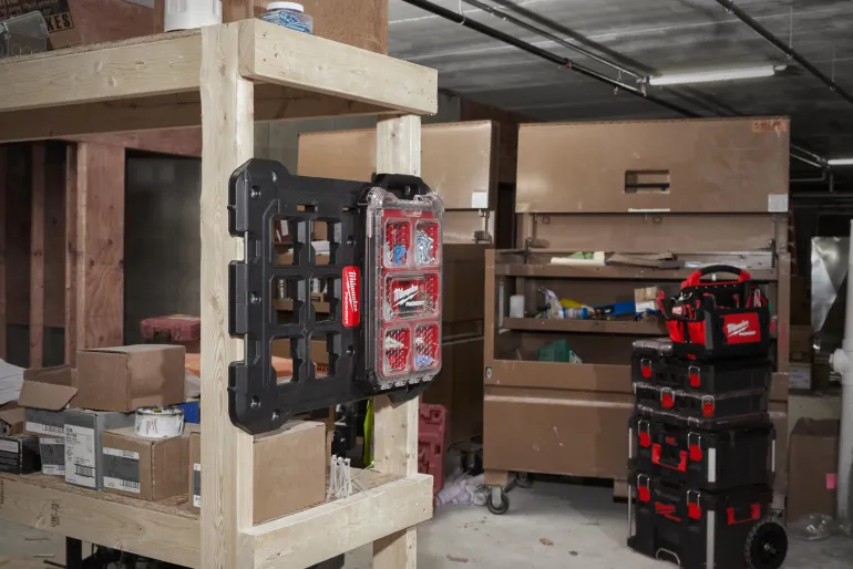 Milwaukee Packout-säilytyslaukku 250x380x120 mm. Sisällä on 5 viisi irrotettavaa ja kiinnitettävää lokeroa, joita voidaan käyttää tavallisimmilla työpaikan tarvikkeilla.
