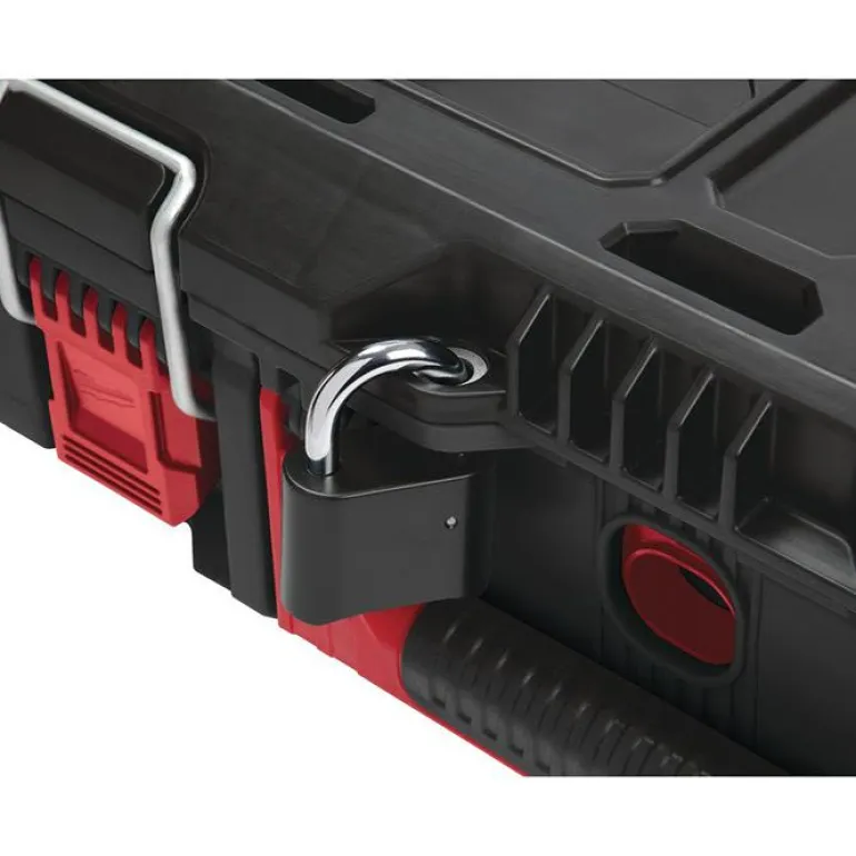 Milwaukee Packout -säilytyslaatikko 560x410x170 mm. IP65-luokitus pitää sateen ja rakennuspölyn poissa. Metallivahvisteet takaavat pidemmän käyttöiän.