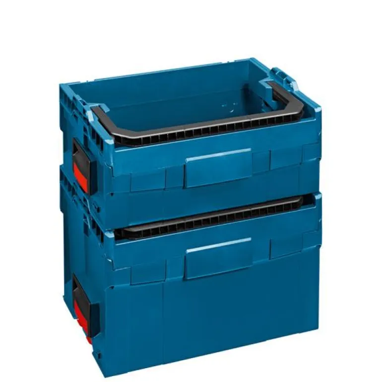 Työkalulaatikko, jossa on suuri kahva. Avoimen mallin ansiosta kaikki osat helposti saatavilla. Laukut voidaan pinota ja kiinnittää toisiinsa niissä olevien liittimien avulla.
