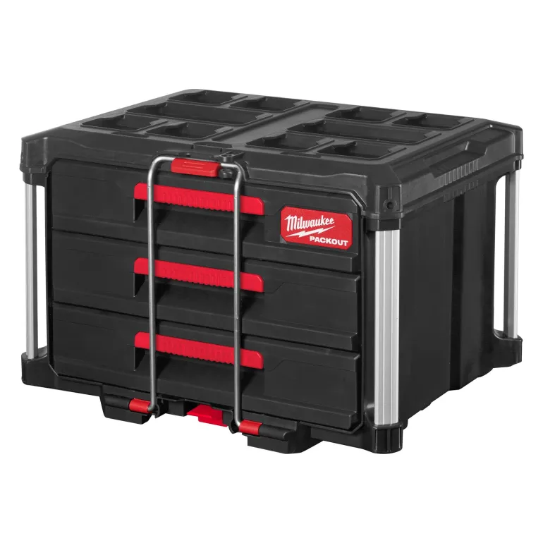 PACKOUT työkalupakki mahdollistaa helpon pääsyn työkaluihin jopa silloin, kun se on asetettu PACKOUT-pinon alimmaiseksi. Liukuvat kuulalaakeroidut vetolaatikot kestävät jopa 11 kg painon. Turvatangon lukitseminen estää laatikoiden aukeamisen kuljetuksen aikana ja mahdollistaa laatikoiden sulkemisen riippulukolla. Jokaisessa laatikossa on sarja nopeasti liikuteltavia jakajia, mitkä mahdollistavat laatikoiden mukauttamisen käyttöön sopivaksi. Metallivahvisteiset kulmat. Valmistettu iskunkestävästä polymeerista. Osa PACKOUT säilytysjärjestelmää.