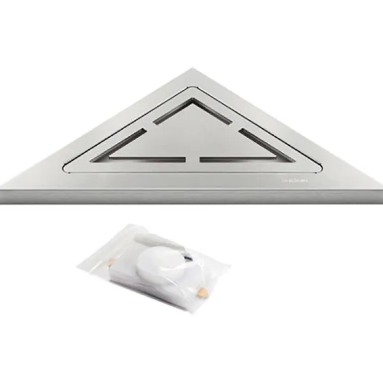 Unidrain 2850 Anniversario on harjatusta ruostumattomasta teräksestä valmistettu saippuahylly, nurkka-asennukseen asennusliiman avulla. Ritilä voidaan irrottaa puhdistuksen aikana.