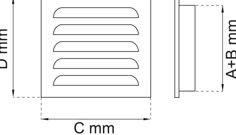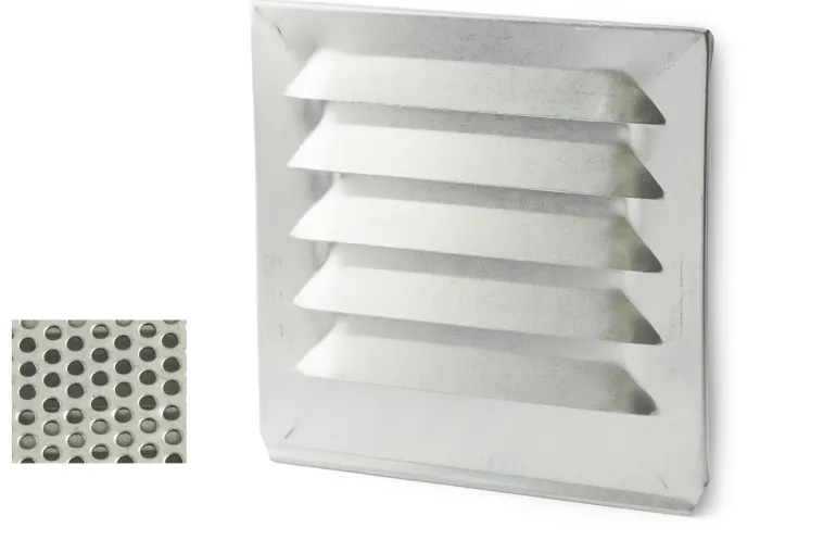 Teräksinen säle ja kehys. Taustan reikäpelti, jonka reikien koko on 3 mm, estää hiirien pääsyn sisään.
