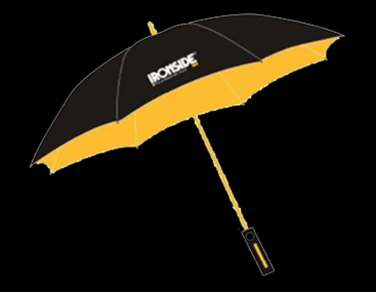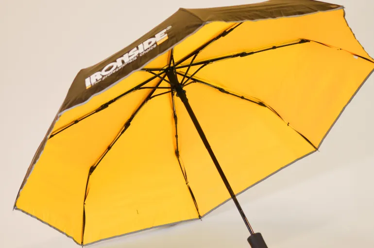 Musta sateenvarjo halkaisijaltaan 950 mm, UV-pinnoite sekä lasikuitu- ja kumikahva. Varustettu heijastimella.