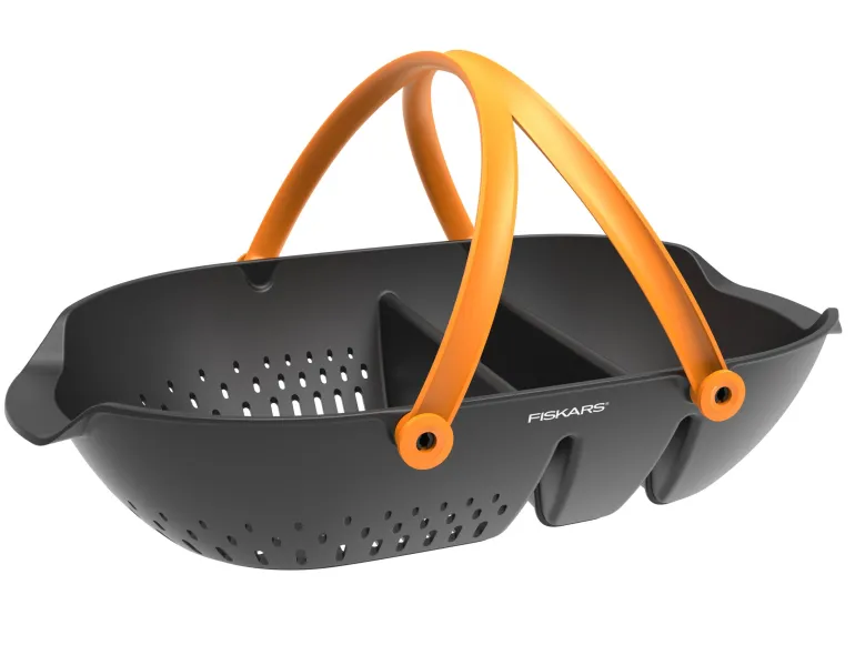 Käytännöllinen satokori, jossa ergonominen kahva ja sivukahva. Varustettu erillisellä lokerolla sadon huuhtelua varten.