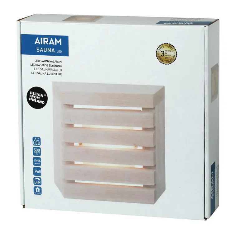 Saunaled Sq on tyylikäs saunavalaisin, jossa on kiinteä AC-led. Valaisin on himmennettävä, joten voit säätää valon määrää tilanteeseen sopivaksi. Valaisimen puuvarjostin valmistetaan Suomessa laadukkaasta kotimaisesta tervalepästä. Pöly- ja vesitiiviin valaisimen voi pinta- tai uppoasentaa seinään. Suosittelemme puuosien pintakäsittelyä puusuoja-aineella ennen käyttöönottoa. Voit myös sävyttää puuosat yksilöllisesti saunasi sisustukseen sopivaksi.
