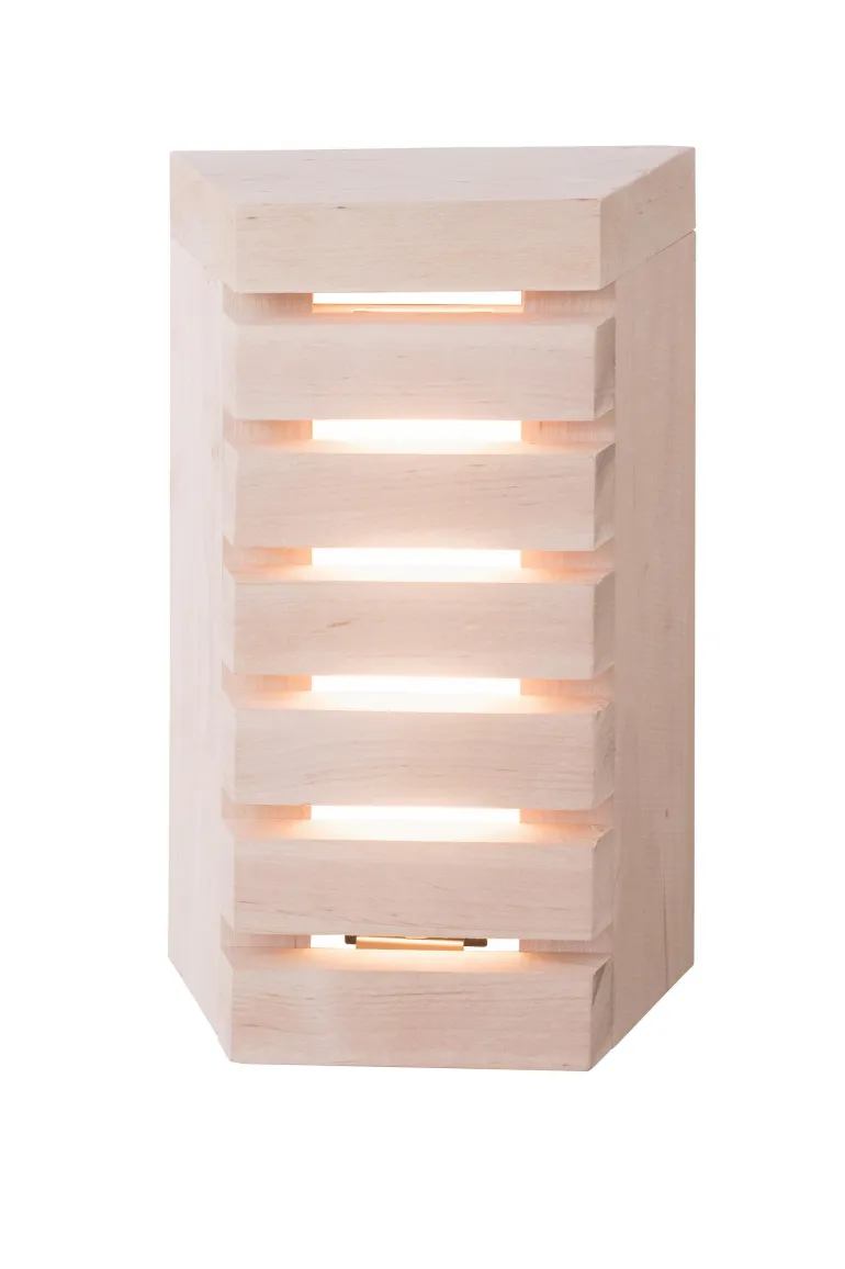Saunaled Vert on tyylikäs saunavalaisin, jossa on kiinteä AC-led. Valaisin on himmennettävä, joten voit säätää valon määrää tilanteeseen sopivaksi. Valaisimen puuvarjostin valmistetaan Suomessa laadukkaasta kotimaisesta tervalepästä. Pöly- ja vesitiiviin valaisimen voi pinta- tai uppoasentaa seinään, Saunaled Vert on asennettavissa myös nurkkaan. Suosittelemme puuosien pintakäsittelyä puusuoja-aineella ennen käyttöönottoa. Voit myös sävyttää puuosat yksilöllisesti saunasi sisustukseen sopivaksi.
