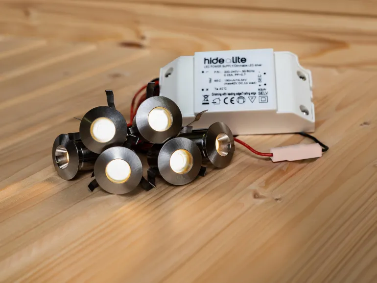 Täydellinen sarja, jonka avulla on helppo asentaa huomaamattomia ja tunnelmallisia pieniä valopisteitä saunan valaistukseksi. Harjatusta teräksestä valmistetut valaisimet, joissa on mukautettu valon virtaus häikäisyn estämiseksi. Valaisimissa on kaksi kaapelia sekä pikaliitäntä kätevää sarjakytkentää varten. Sarjassa on 6 kpl valaisinta, joissa on vaihehimmennettävä ohjain, jatkokaapeli ja liitäntäjohdot. Ohjaimella voidaan käyttää ja himmentää 5-12 valaisinta.