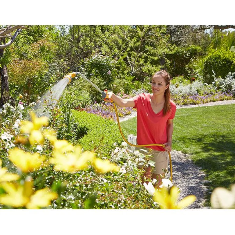 Sauvasprinkleri, jossa on 90 cm:n kahva pitkälle ulottuvaan kasteluun. Säädettävä 180 asteen suihkupää tekee kastelusta entistäkin mukavampaa eri korkeuksilla. Siinä on myös lukittava ja portaaton suihkutusliipaisin.