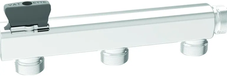 Seinäjakaja 3 putkelle, ilman sulkua, korvaa jakajakaapin ja mahtuu komuutin taakse. Jakaja minimoi vesivahingon riskin, koska kaikki liitokset ovat seinän ulkopuolella. Voidaan liittää Vatette V6 -sekoittimen kiinnikkeisiin ja Vatette V6 -seinän läpivienteihin.