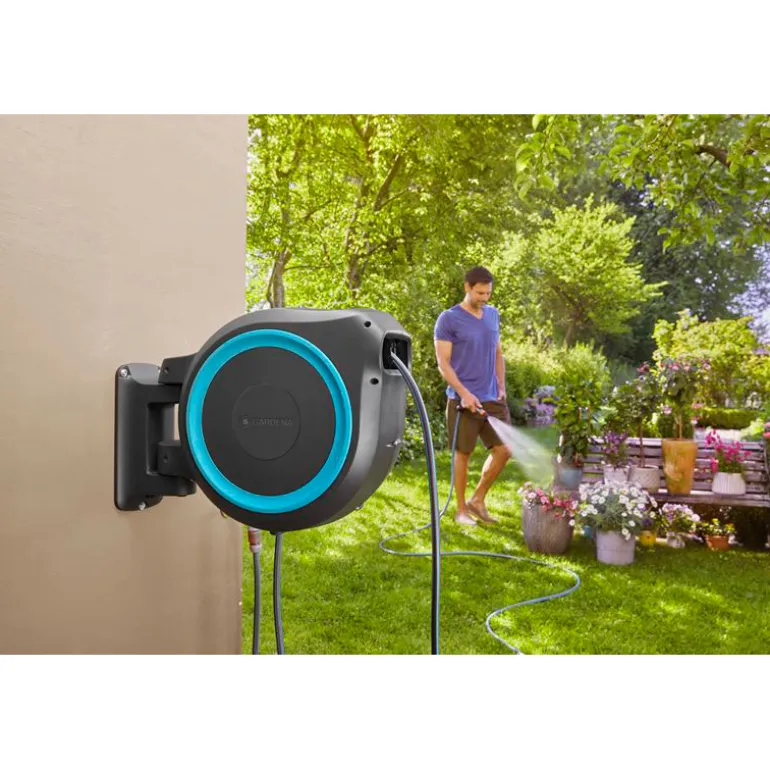 Käytön jälkeen lyhyt nykäisy letkusta vapauttaa lukituksen. Letkukelan sisällä oleva jousi kelaa letkun takaisin automaattisesti, luotettavasti ja tasaisesti. Innovatiivinen RollControl-teknologia varmistaa turvallisen ja hallitun takaisinkelautumisen. Integroidun letkunohjaimen ansiosta letku ohjautuu kelalle tasaisesti ilman taittumista tai menemistä solmuun. Seinätelineessä on tilaa useille kasteluvälineille, jotta ne ovat aina kätevästi lähettyvillä.