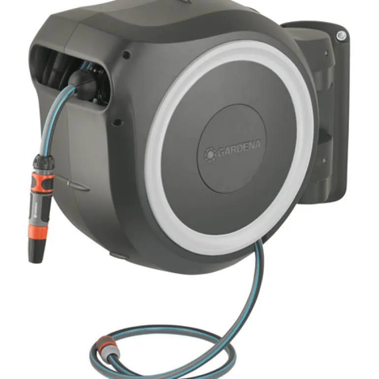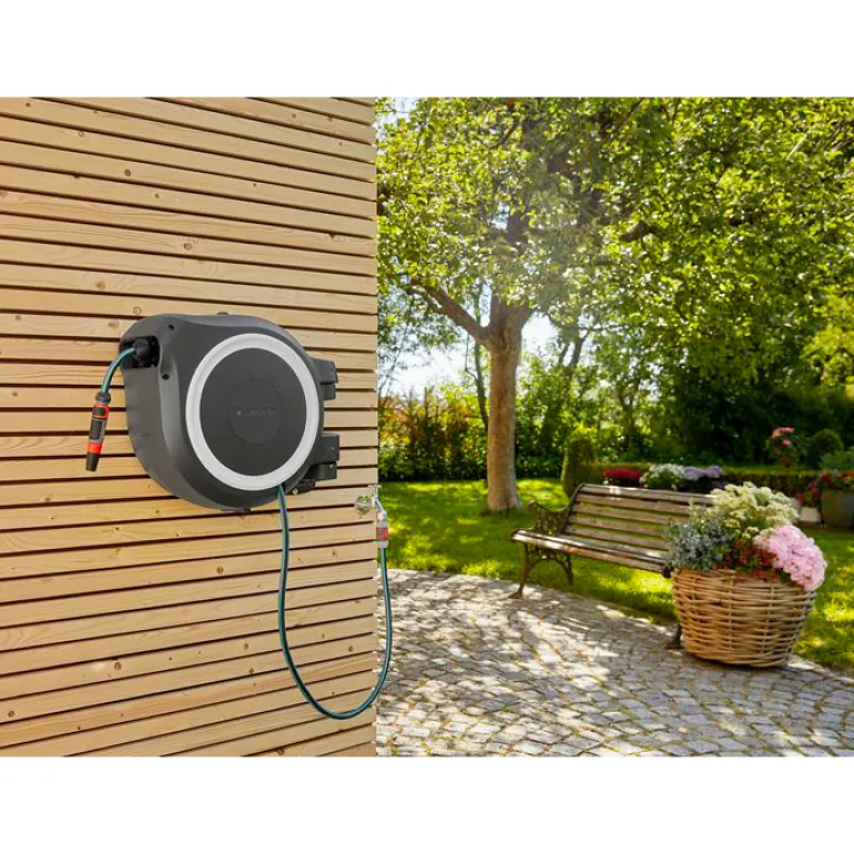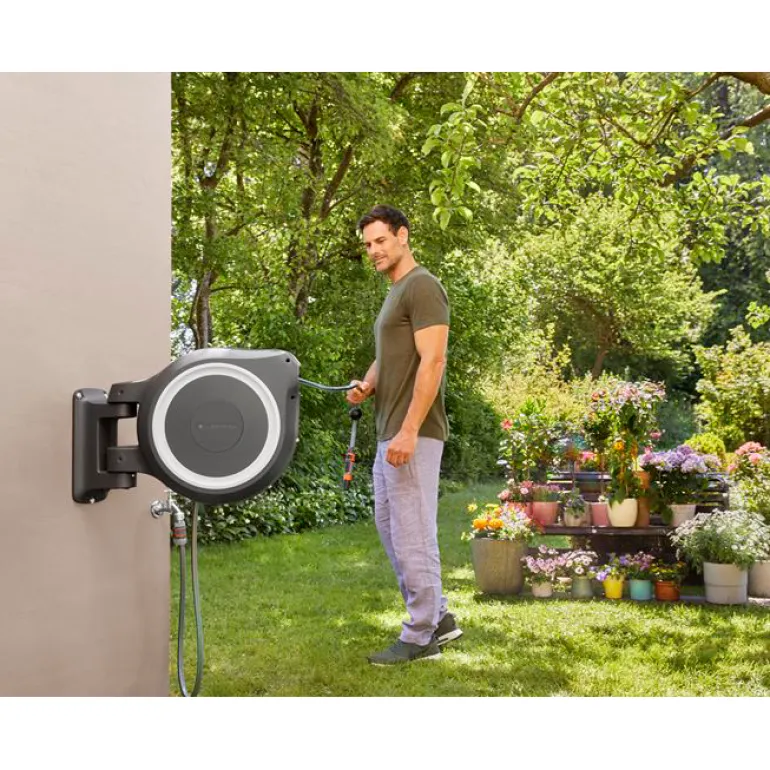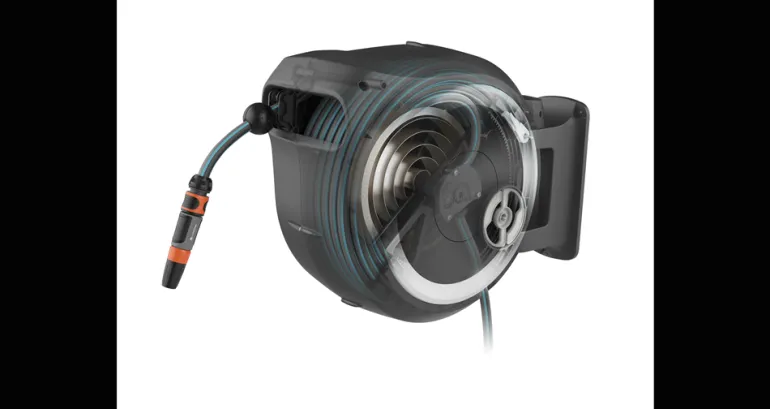 Laatikon liikkuvuuden ansiosta saat erityisen suuren ulottuvuuden ja letkua estetään taittumasta tai kiertymästä. Letku vedetään helposti ulos kastelua varten, ja erityisen lyhyiden lukituspisteiden ansiosta se lukittuu automaattisesti haluttuun pituuteen, kun lopetat vetämisen. Kun työ on tehty riittää, että nykäiset letkusta kevyesti lukituksen vapauttamiseksi, sillä sen integroitu jousi vetää puutarhaletkun automaattisesti luotettavasti ja tasaisesti. Innovatiivisen RollControl-tekniikan ansiosta sisäänveto on erityisen turvallista ja hallittua. Integroitu letkunohjain varmistaa, että letku on kierretty tasaisesti ilman sotkeutumista.
